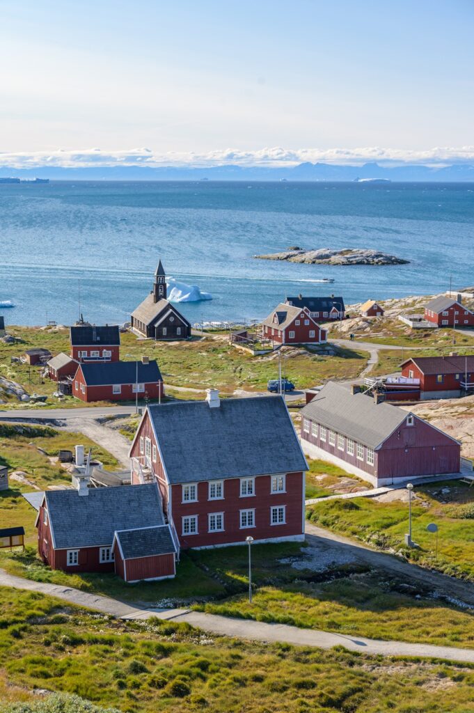 Das Sightseeing-Programm in Qeqertarsuaq ist schnell erledigt: Die malerische Kirche, die Kuannit Kunstgalerie, das Heimatmuseum liegen alle in Fußweite vom Zentrum. Auch ein Muss: der schwarze Strand von Siorarsuit, auf dem kohlefarbener Sand mit azurschimmernden Eisbrocken ein Mosaik bildet. Und natürlich der Fußballplatz mit dem grell-grünen Kunstrasen, der einen bunten Kontrast zu den bläulich-dunklen Eisbergen bildet, die gleich hinter den Zuschauerrängen im Meer dümpeln. So bleibt Zeit, sich der Natur zuzuwenden. Und von der gibt es reichlich auf Qeqertarsuaq, wobei der grönländische Name schlicht »Große Insel« bedeutet. Wer die zentrale Siedlung bei einer Wanderung in die Wildnis verlassen will, der muss die Steilhänge hinaufklettern, die das Dorf vom Inselinneren abschirmen.