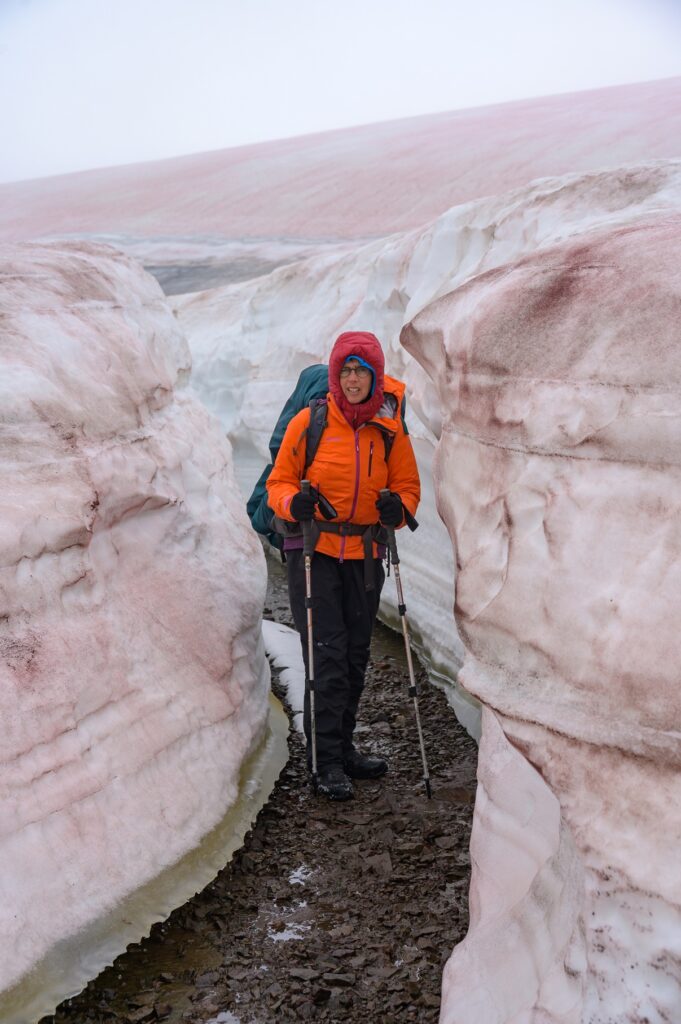 Durch knöchelhohes Gestrüpp geht es hoch in die Lyngmark-Berge. So dünn wie der Pfad sich zeigt, so wenige Wanderer werden es in der kurzen Saison sein, die sich auf den Weg zum Gletscher Uunartuarsuup Sermia machen, der knapp 1.000 Meter oberhalb der Ortschaft liegt. Quert man zu Beginn noch plätschernde Bachläufe mit violetten, gelben und blauen Blumen daneben, so wird die Vegetation droben immer spärlicher und abgelöst von schlammbraunem Geröll. Ein ausgedienter Hundeschlitten steht plötzlich am Wegesrand, etwas weiter parkt ein Schneemobil seit dem Frühling im Gesträuch. Kurz darauf ist die Vereinshütte vom örtlichen Skiclub erreicht. Von dort aus geht es über rötliche Schneefelder. Rosa Schnee? Mineralien sollen dem Weiß den ungewöhnlichen Farbton verpassen. Zügig kommen dann die quietschblau gestrichenen Wände der Disko Mountain Lodge in Sicht, die in Panoramalage auf einem Hügel gleich neben den Apostelbergen thront.