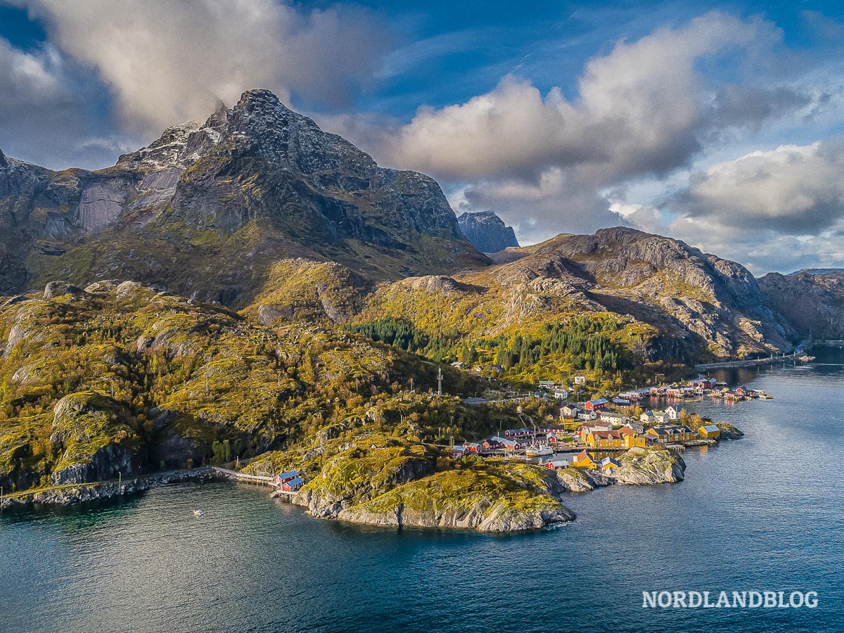 Blick vom Meer auf den Fischerort Nusfjord