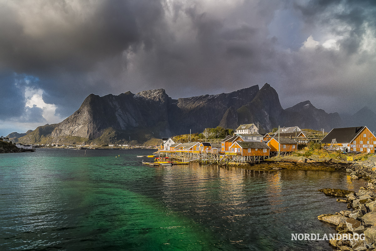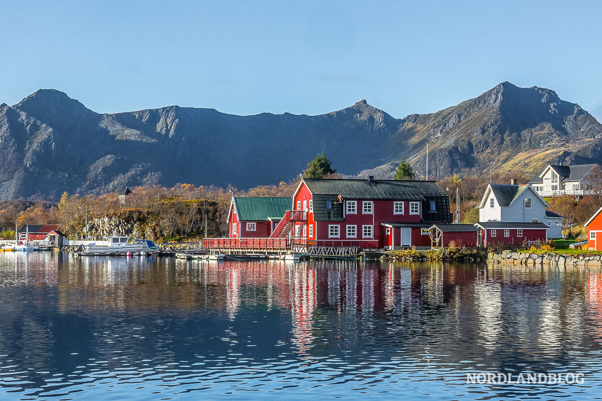 Die Rorbuer auf den Lofoten leuchten in der Herbstsonne
