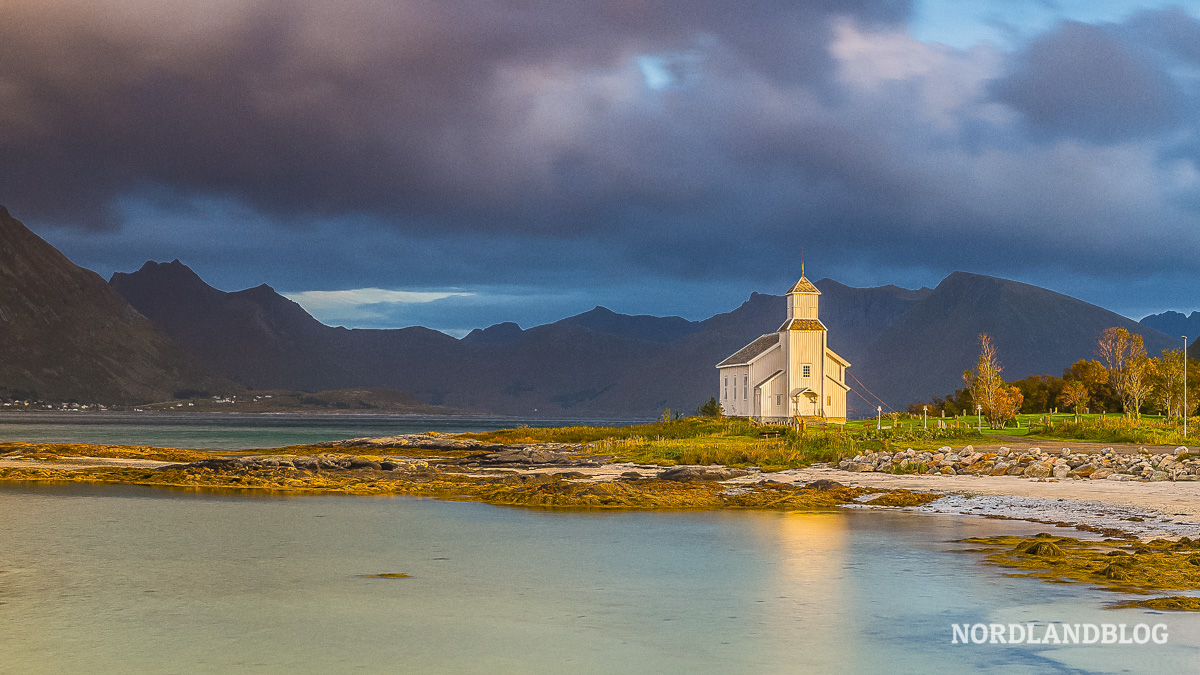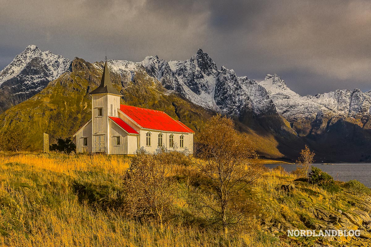 Die Kirche von Sildpollnes auf den herbstlichen Lofoten