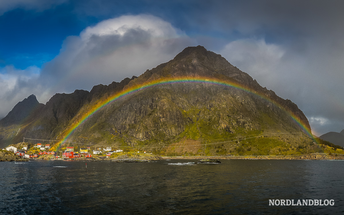 Herbstwetter im Dorf Å mit einem herrlichen Regenbogen